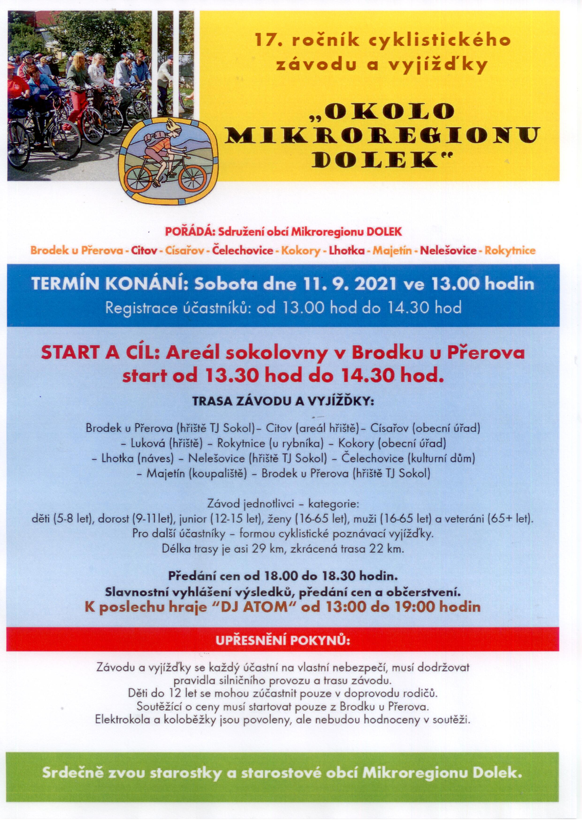 17. ročník cyklistického závodu a vyjížďky "Okolo mikroregionu Dolek" se koná v sobotu 11. září 2021 ve 13:00 hodin. Start a cíl: areál sokolovny Brodek u Přerova. Start od 13:30 do 14:00 hodin.