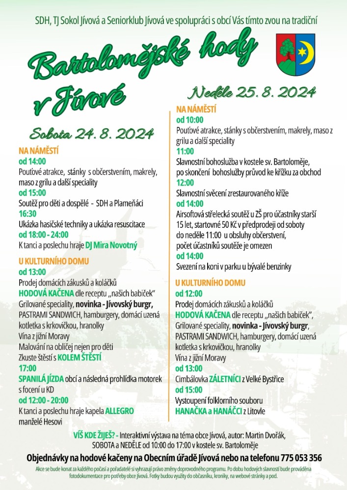 SDH, TJ Sokol a Seniorklub Jívová ve spolupráci s obcí Vás tímto zvou na tradiční Bartolomějské hody v Jívové v sobotu 24. 8. 2024 a v neděli 25. 8. 2024 s bohatým kulturním programem.