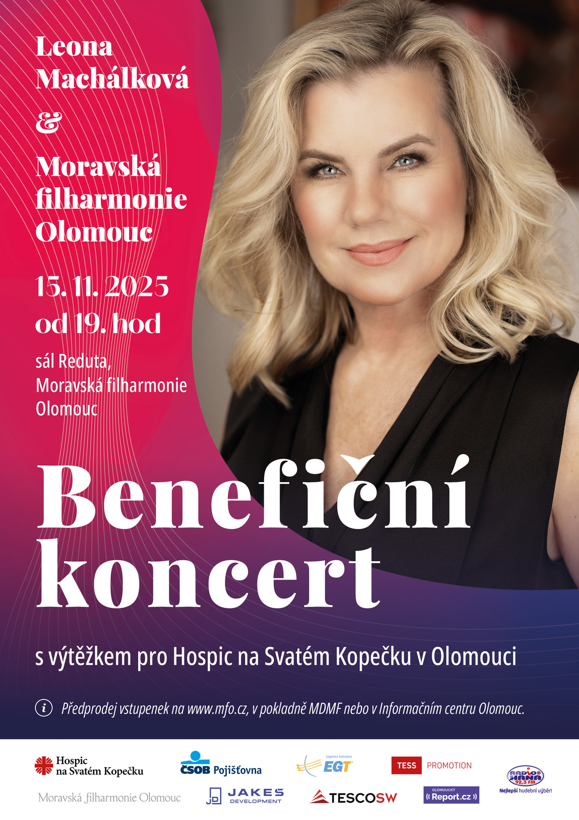 Pozvánka na benefiční koncert Leony Machálkové a Moravské filharmonie Olomouc v sobotu 15. listopadu 2025 od 19:00 hod. v sále Reduta, Moravská filharmonie, Olomouc.