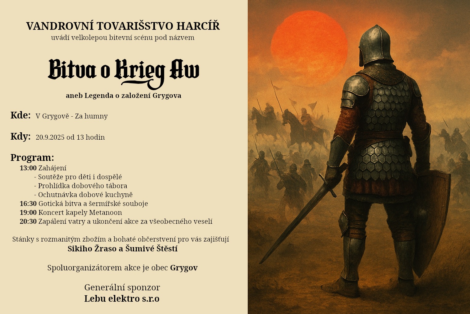 Vandrovní Tovarišstvo Harcíř uvede velkolepou bitevní scénu pod názvem Bitva o Krieg Aw aneb Legenda o založení Grygova v sobotu 20. září 2025 od 13:00 hodin v Grygově (Za humny).