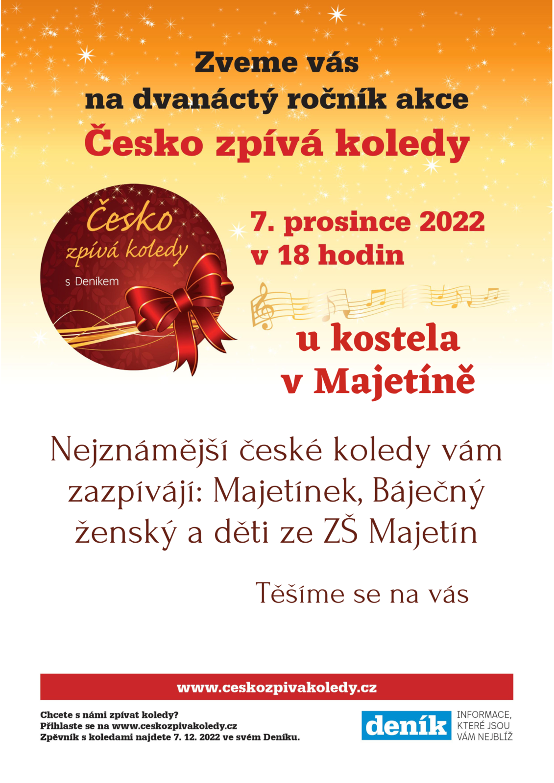 Zveme Vás na 12. ročník akce Česko zpívá koledy ve středu 7. prosince 2022 v 18:00 hodin u kostela v Majetíně. Nejznámější české koledy Vám zazpívají: Majetínek, Báječný ženský a děti ze ZŠ Majetín. Těšíme se na Vás.