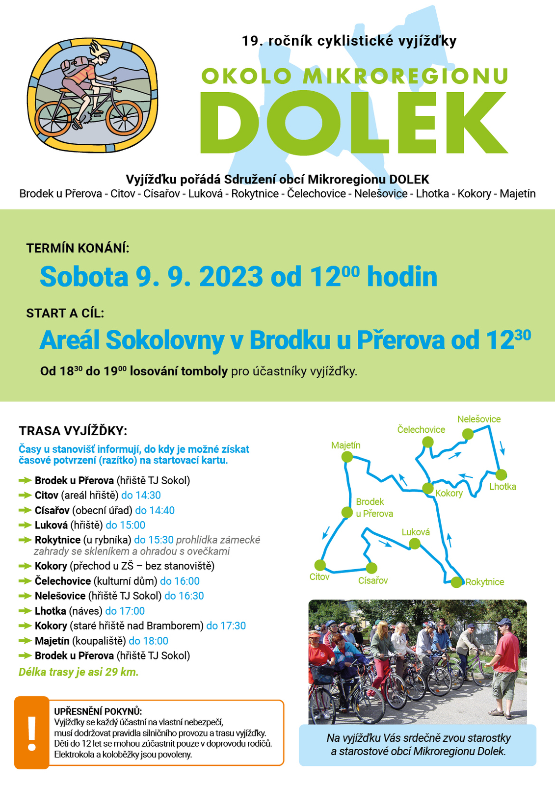 Sdružení obcí mikroregionu Dolek pořádá v sobotu 9. září 2023 19. ročník cyklistické vyjížďky Okolo mikroregionu Dolek. Start a cíl v areálu sokolovny v Brodku uPřerova od 12:30 hodin, délka trasy 29 km.