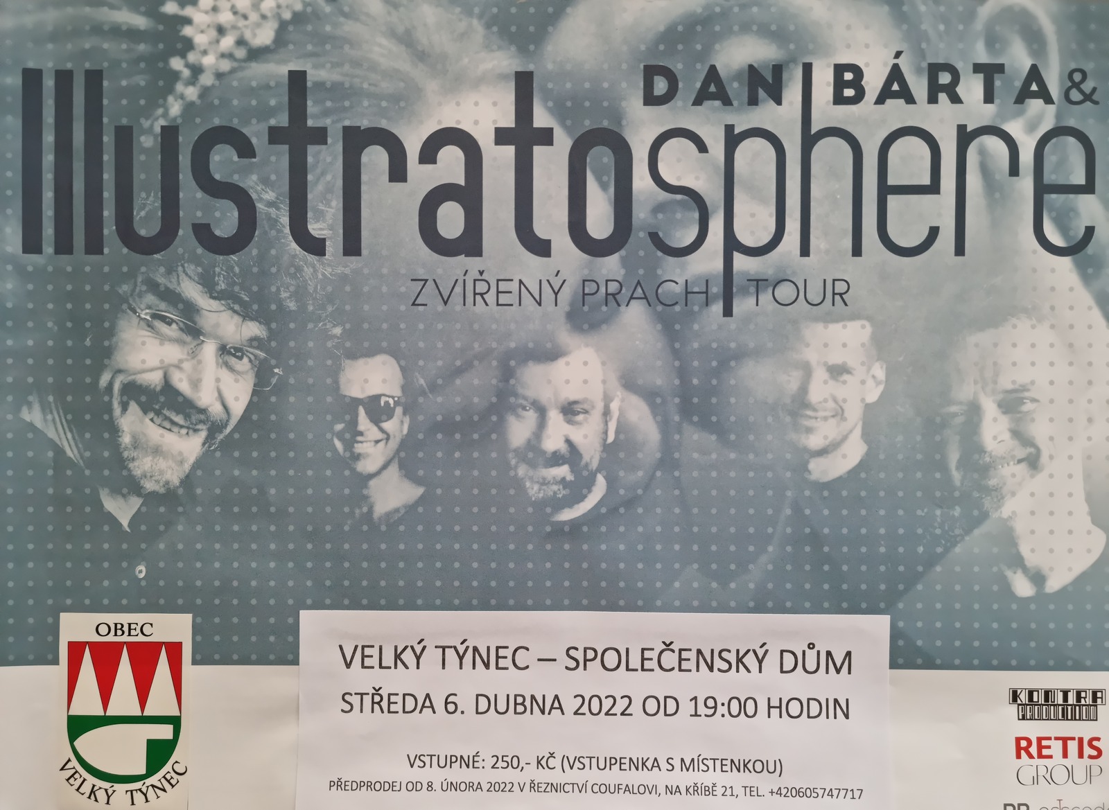 Obec Velký Týnec pořádá koncert Dan Bárta - Illustratosphere tour ve středu 6. dubna 2022 ve společenském domě ve Velkém Týnci. Začátek v 19:00 hodin, vstupenka s místenkou 250 Kč. Předprodej vstupenek od 8. 2. 2022 v řeznictví Coufalovi.