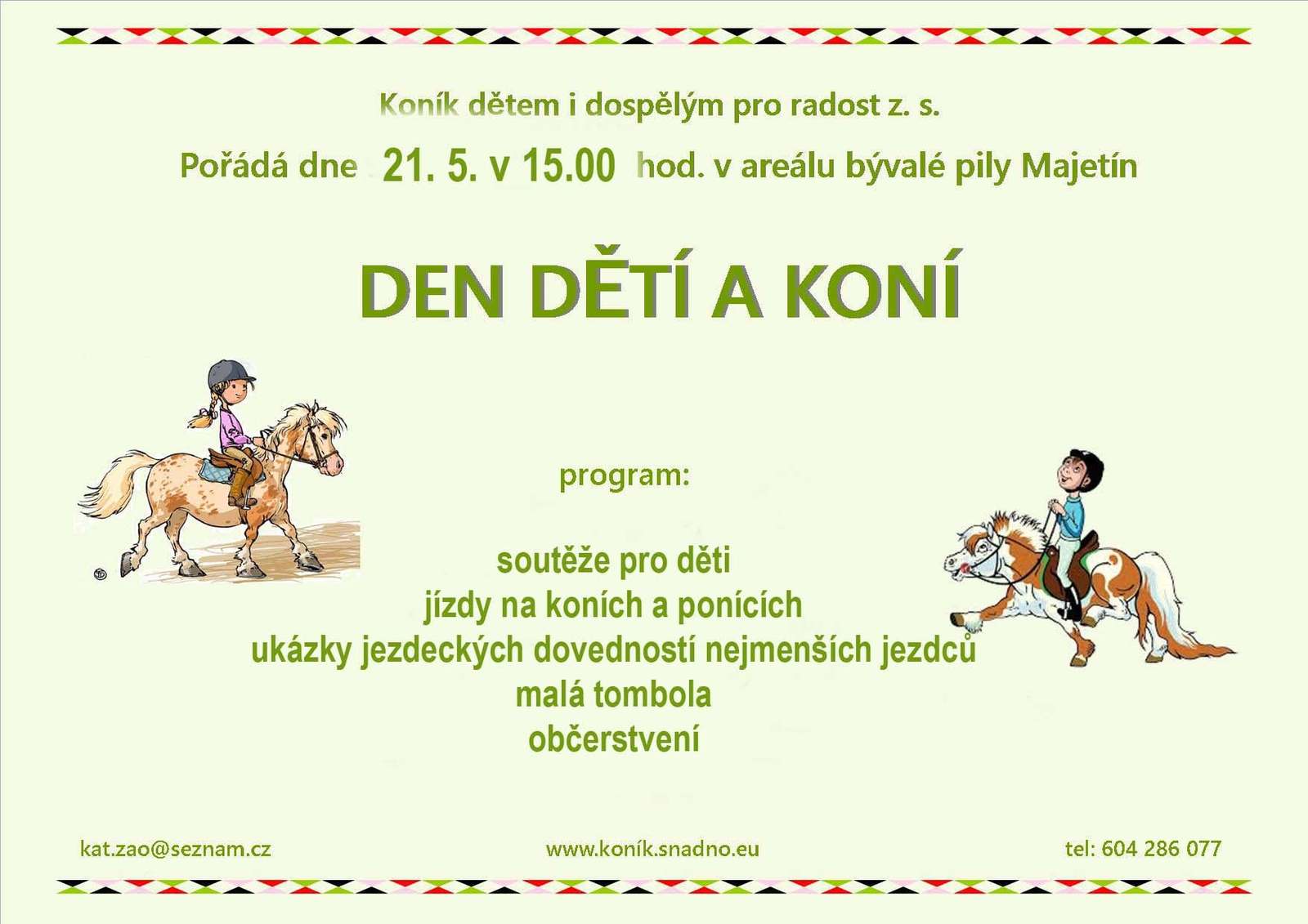 Koník dětem i dospělým pro radost z. s., pořádá v sobotu 21. května 2022 od 15:00 hodin v areálu bývalé pily Majetín "Den dětí a koní".