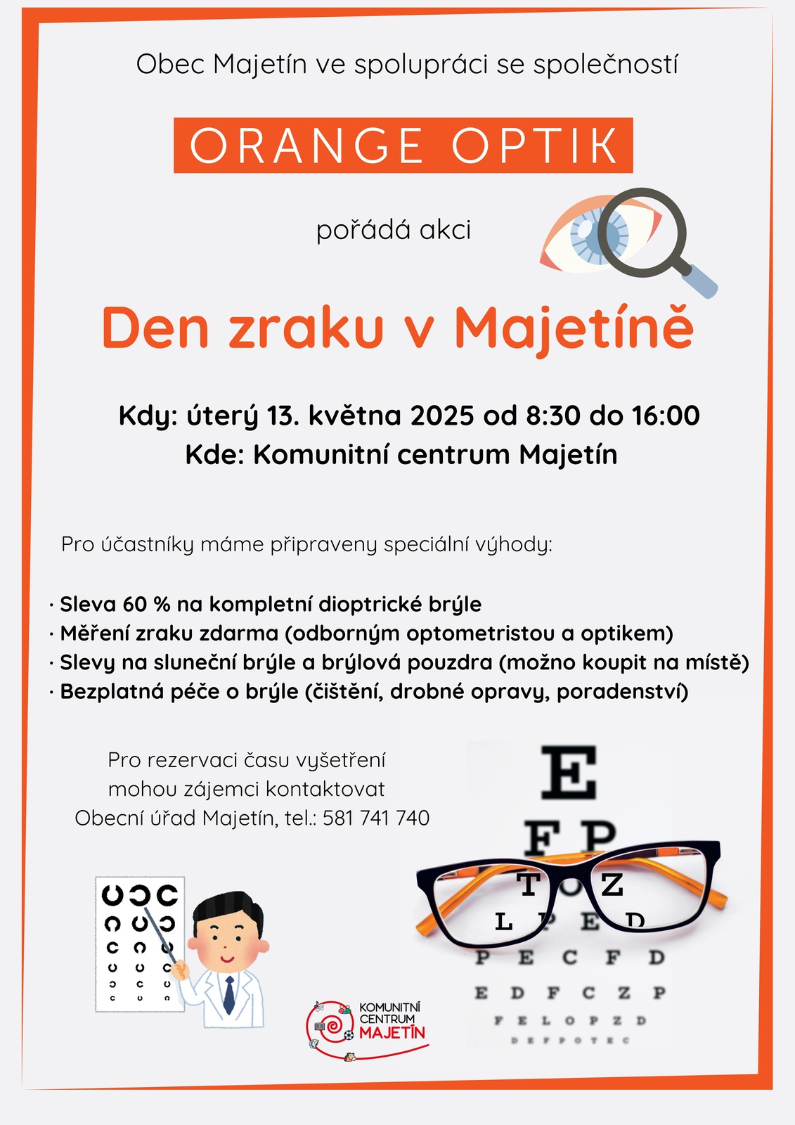 Obec Majetín ve spolupráci se společností Orange Optik pořádá v úterý 13. května 2025 od 8:30 do 16:00 v Komunitním centru Majetín „Den zraku v Majetíně“. Vyšetření je zdarma. V případě zájmu volejte na telefonní číslo OÚ Majetín 581 741 740.