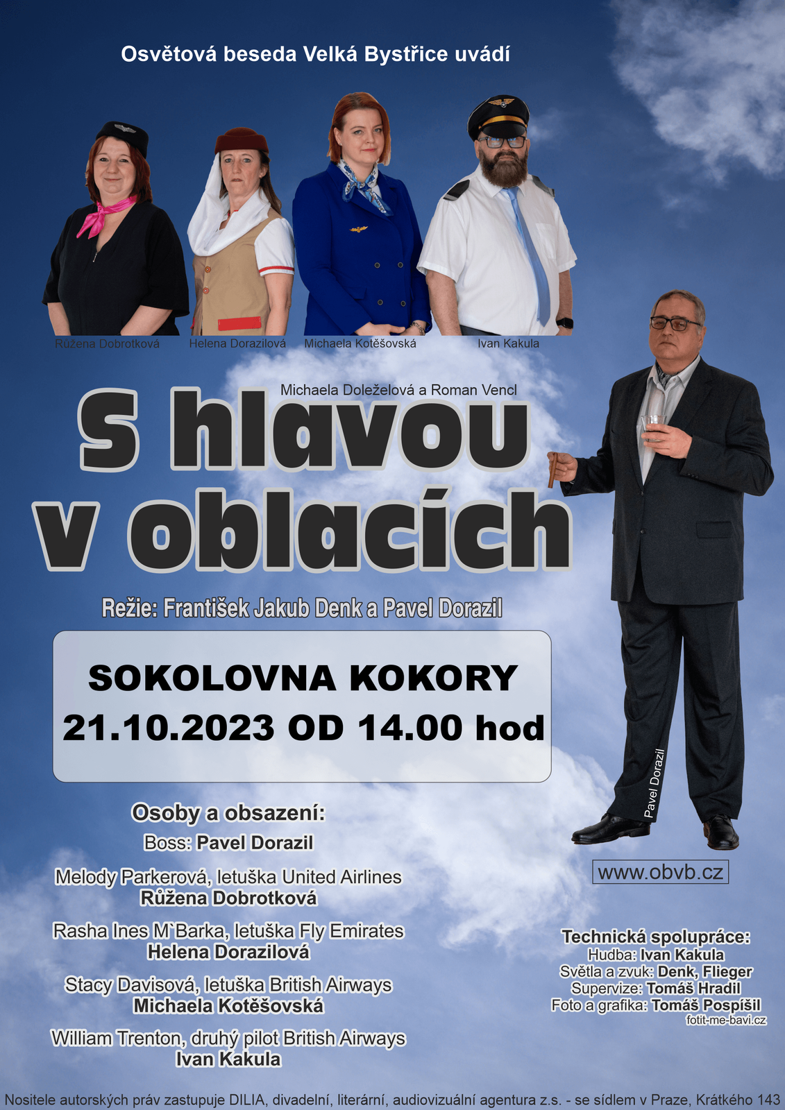Osvětová beseda Velká Bystřice Vás zve na divadelní hru "S hlavou v oblacích"  v sobotu 21. října 2023 od 14:00 hodin,