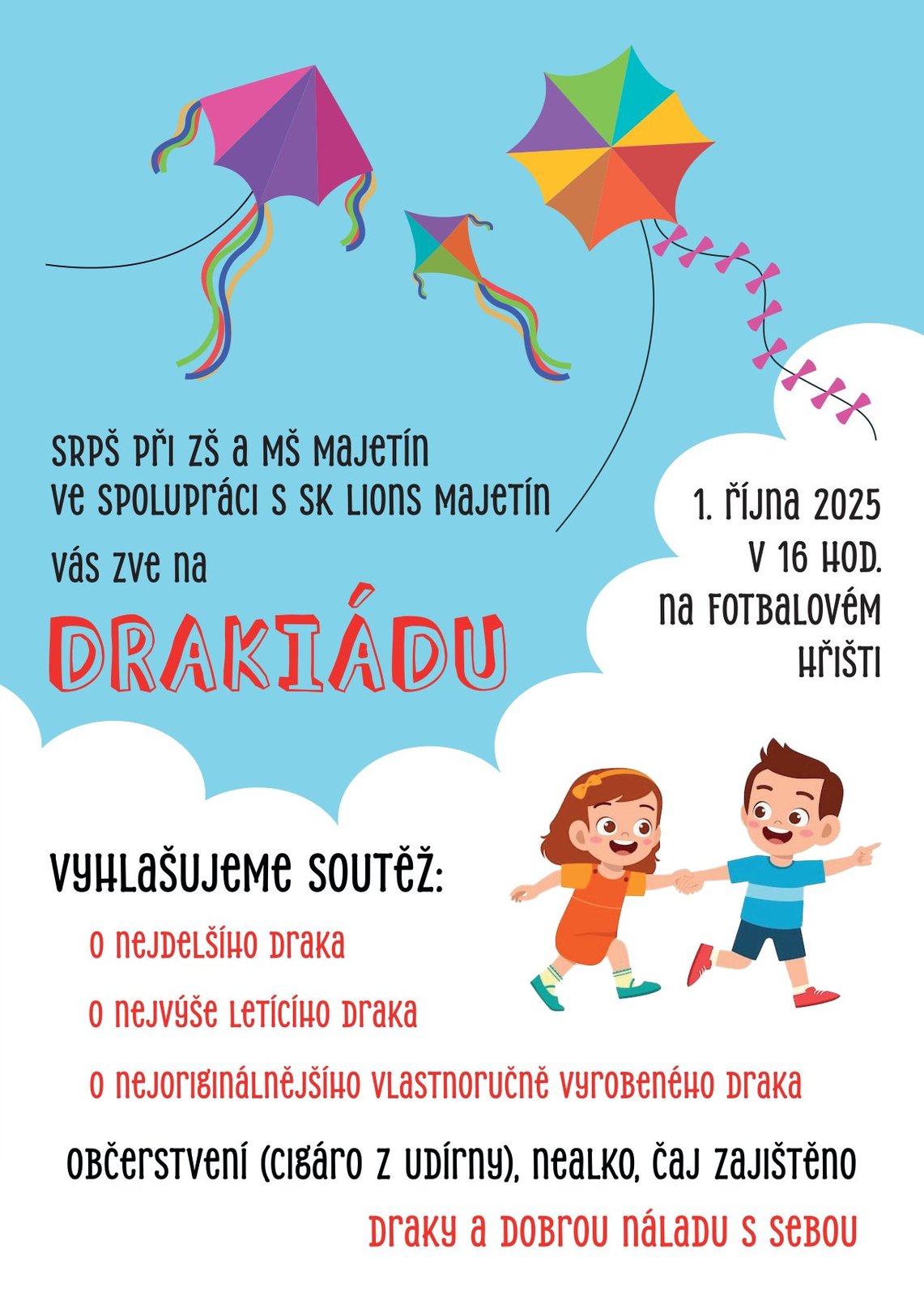 SRPŠ při ZŠ a MŠ Majetín ve spolupráci s SK Lions Majetín Vás zve na DRAKIÁDU ve středu 1 října 2025 v 16:00 hodin na fotbalovém hřišti. Občerstvení zajištěno, draky a dobrou náladu s sebou.