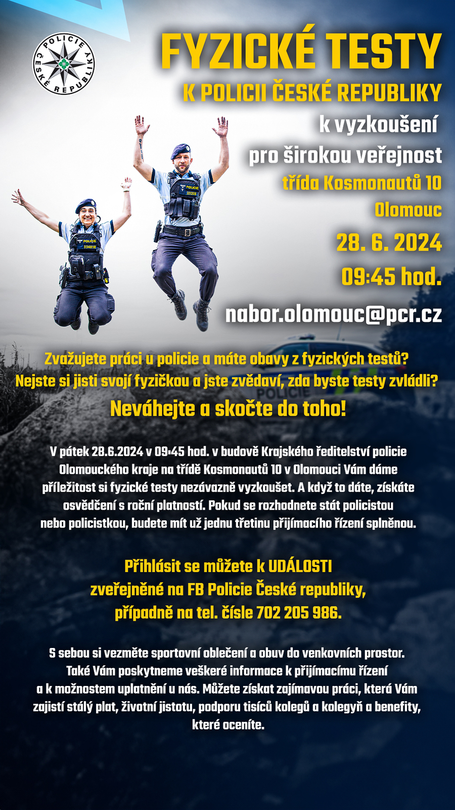 V pátek 28. 6. 2024 v 9:45 hod. v budově Krajského ředitelství policie Olomouckého kraje na třídě Kosmonautů 10 v Olomouci Vám dáme příležitost si fyzické testy nezávazně vyzkoušet. A když to dáte, získáte osvědčení s roční platností. Pokud se stanete stát se policistou nebo policistkou, bude mít už jednu třetinu příjímacího řízení splněnou.