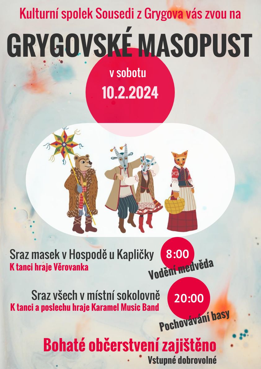 Kulturní spolek Sousedi z Grygova Vás zvou na "GRYGOVSKÉ MASOPUST" v sobotu 10. února 2024. Od 8:00 hodin vodění medvěda, sraz masek v hospodě U Kapličky, hraje kapela Věrovanka. Od 20:00 hodin pochovávání basy, sraz všech v místní sokolovně. K tanci i poslechu hraje Karamel Music Band. Bohaté občerstvení zajištěno, vstupné dobrovolné.