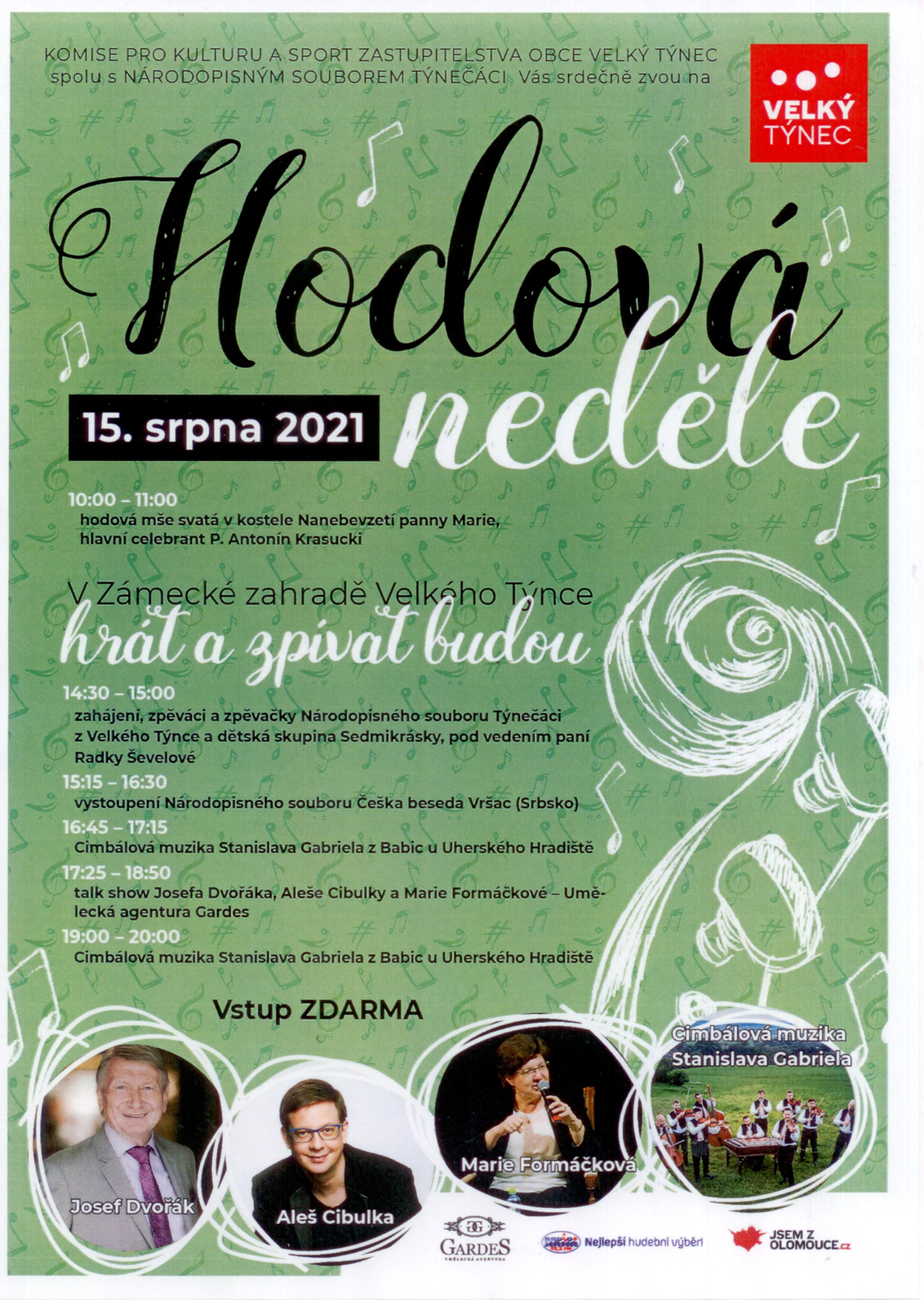 Komise pro kulturu a sport Zastupitelstva obce Velký Týnec spolu s národopisným souborem Týnečáci Vás srdečně zvou na "Hodovou neděli" 15. srpna 2021 do zámecké zahrady ve Velkém Týnci. Bohatý kulturní program, vstup je zdarma.