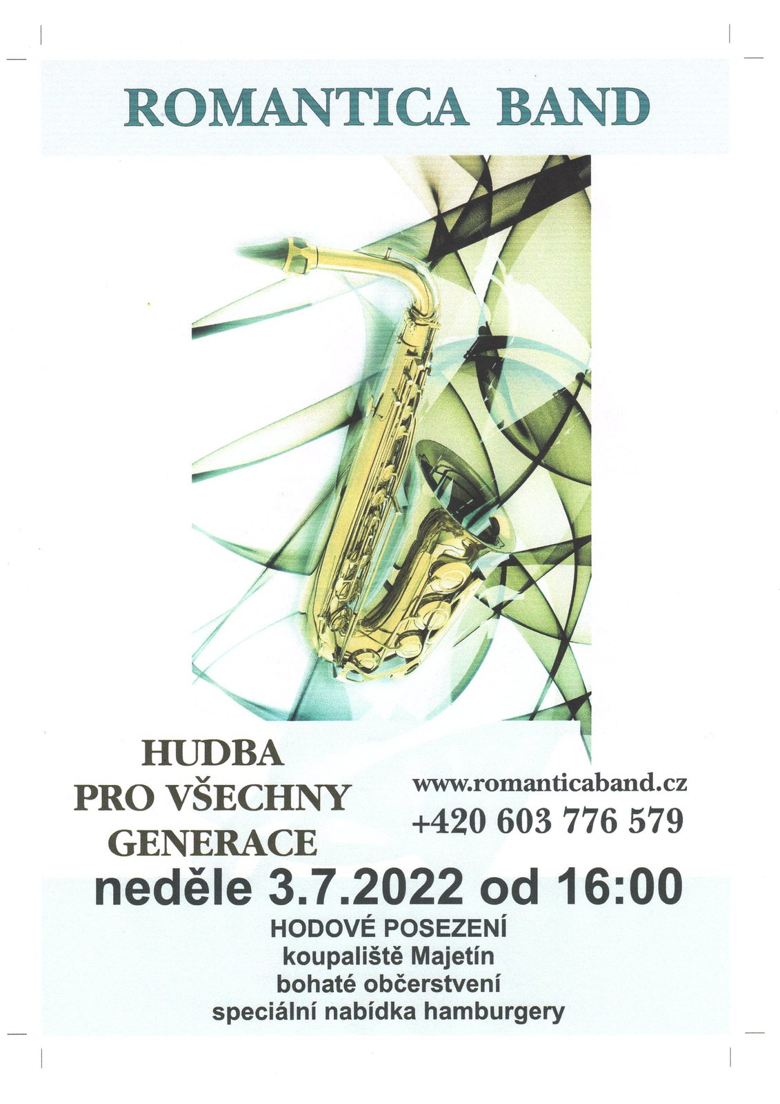 Srdečně Vás zveme na hodový hudební podvečer v ozdravném centru (koupaliště) v neděli 3. července 2022 od 16:00 hodin zahraje skupina ROMANTICA BAND. Občerstvení zajištěno, speciální nabídka hamburgery.