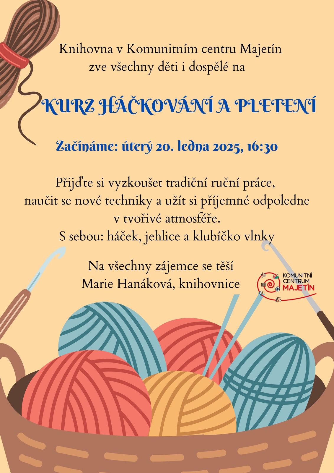 Knihovna v Komunitním centru Majetín zve všechny děti i dospělé na kurz háčkování a pletení. Na všechny zájemce se těší Marie Hanáková, knihovnice.