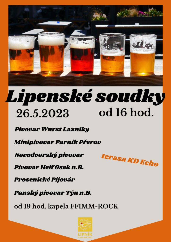 Kulturní dům ECHO Lipník nad Bečvou pořádá 26. května 2023 od 16:00 hodin LIPENSKÉ SOUDKY - pivovar Wurst Lazníky, minipivovar Parník Přerov, Novodvorský pivovar, pivovar Helf Osek n. B., Prosenické Pijovár, Panský pivovar Týn n. B.