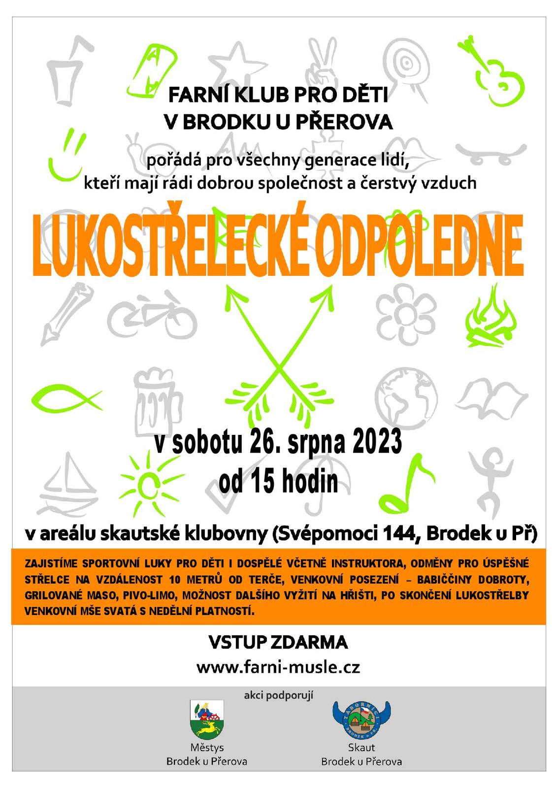 Farní klub pro děti v Brodku u Přerova pořádá pro všechny generace lidí LUKOSTŘELECKÉ ODPOLEDNE v sobotu 26. srpna 2023 od 15:00 hodin v areálu skautské klubovny v Brodku u Přerova. Vstup zdarma. Více informací na www.farni-musle.cz