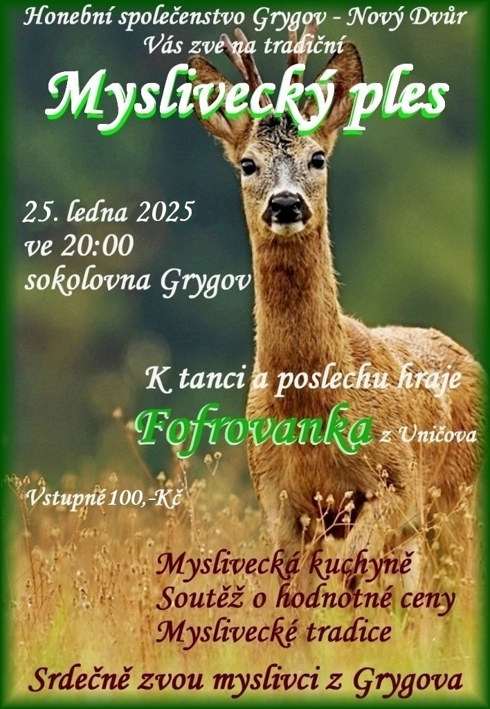 Honební společenstvo Grygov - Nový Dvůr Vás zve na tradiční Myslivecký ples v sobotu 25. ledna 2025 ve 20:00 hodin v sokolovně Grygov. K tanci a poslechu hraje Fofrovanka z Uničova. Vstupné 100 Kč. Srdečně zvou myslivci z Grygova.