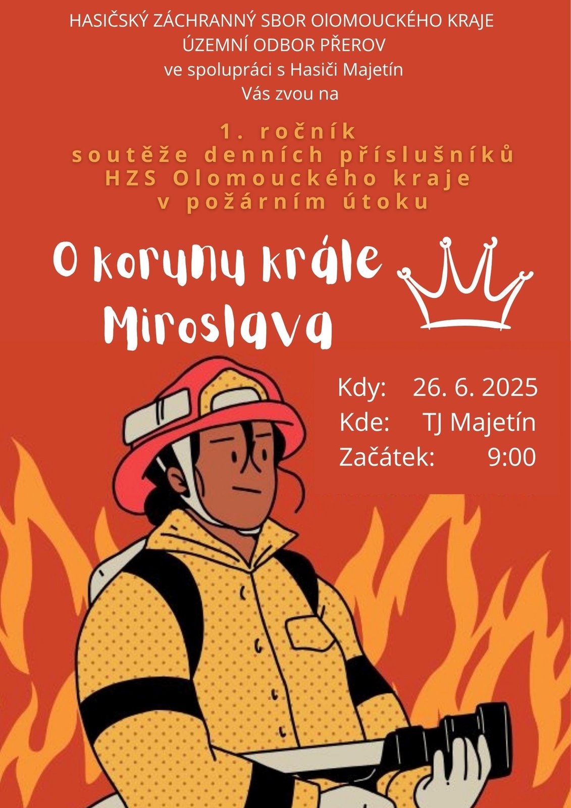 HZS Olomouckého kraje, Územní odbor Přerov ve spolupráci s SDH Majetín Vás zvou na 1. ročník soutěže denních příslušníků HZS Olomouckého kraje v požárním útoku O korunu krále Miroslava ve čtvrtek 26. června 2025 od 9:00 hodin na fotbalovém hřišti v Majetíně.