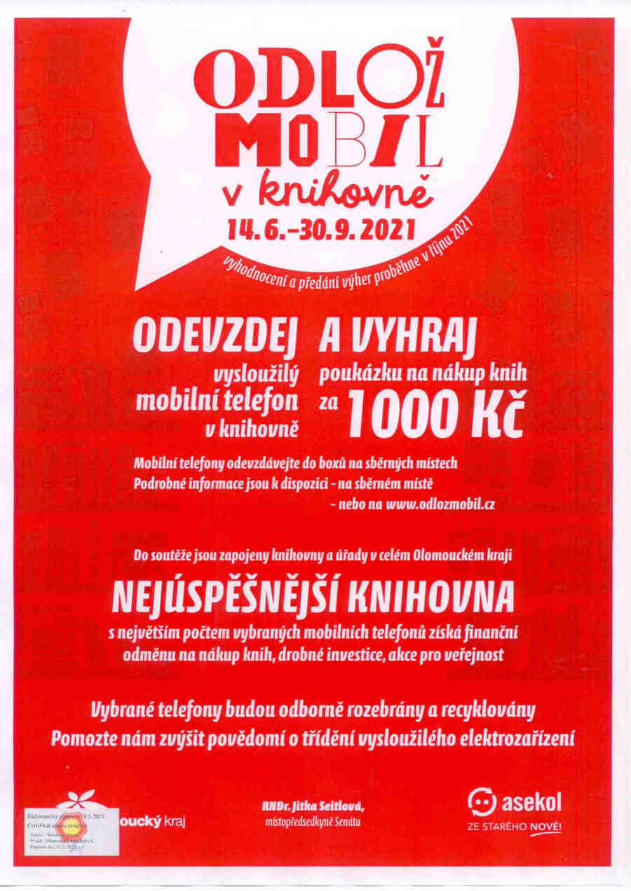 Výzva o zapojení do projektu "ODLOŽ MOBIL V KNIHOVNĚ 2021" - projekt neziskové organizace ASEKOL a Olomouckého kraje, jehož hlavním smyslem je rozšíření povědomí o třídění vysloužilého elektrozařízení. Pro zúčastněné knihovny i jejich čtenáře jsou připraveny hodnotné ceny.