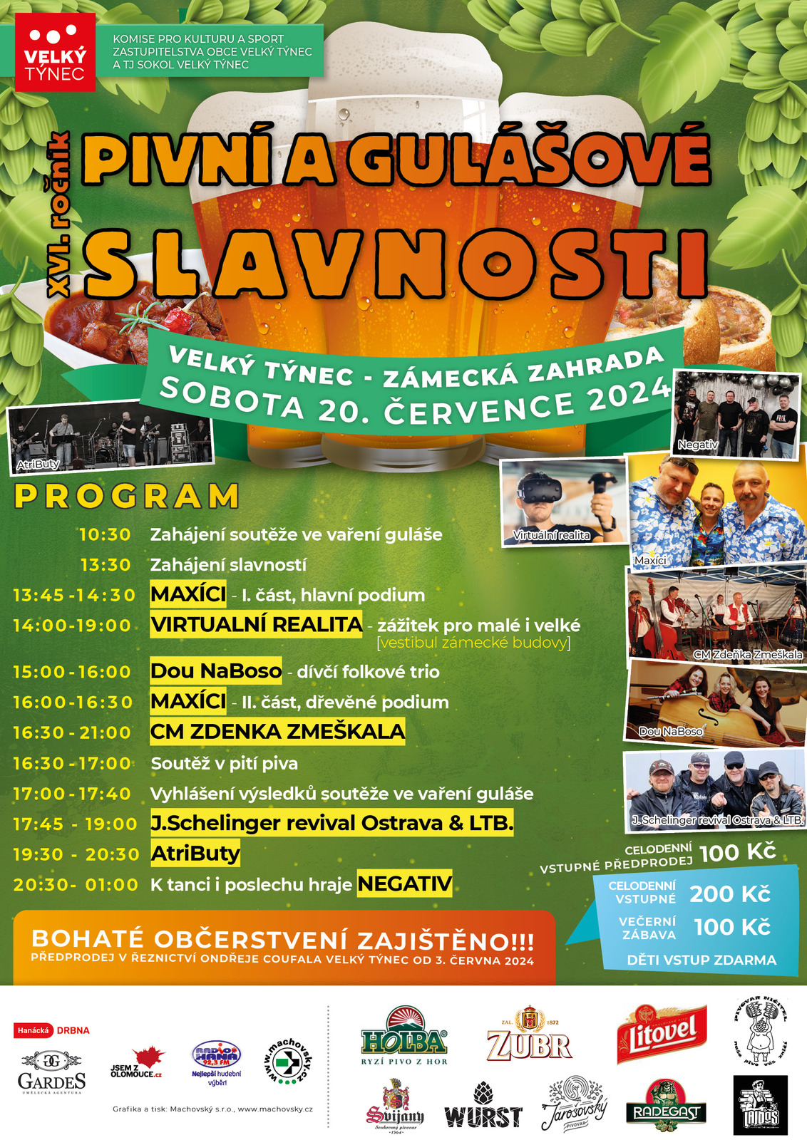 Komise pro kulturu a sport ZO Velký Týnec a TJ SOKOL Velký Týnec Vás zvou na XVI. ročník PIVNÍ A GULÁŠOVÉ SLAVNOSTI v sobotu 20. července 2024 v zámecké zahradě. Na programu vystoupí kapely MAXÍCI, Dou NaBoso, CM Zdenka zmeškala, J. Schelinger revival Ostrava, AtriButy. Bohaté občerstvení zajištěno!