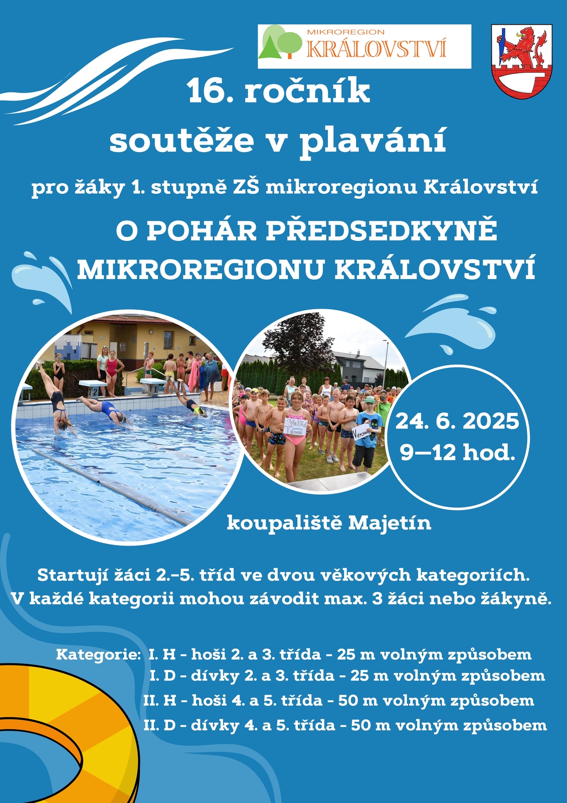 16. ročník soutěže v plavání pro žáky 1. stupně ZŠ mikroregionu Království "O pohár předsedkyně mikroregionu království" se koná v úterý 24. června 2025 od 9:00 hodin. Startují žáci 2. - 5. tříd ve dvou věkových kategoriích.