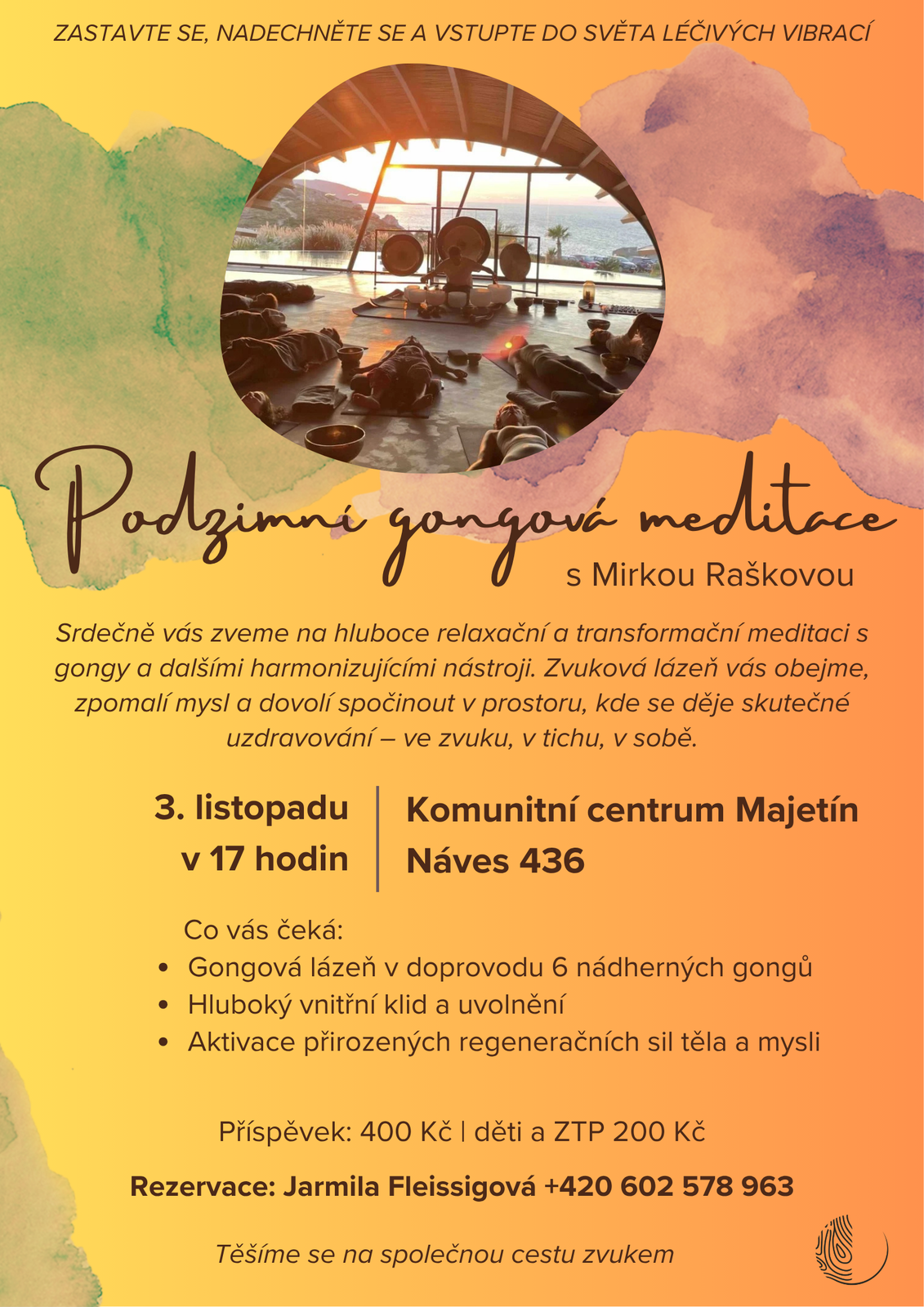 Srdečně vás zveme na hluboce relaxační a transformační meditaci s gongy v Komunitním centru Majetín 3. listopadu 2025 v 17:00 hodin. Rezervace: Jarmila Fleissigová +420 602 578 963.