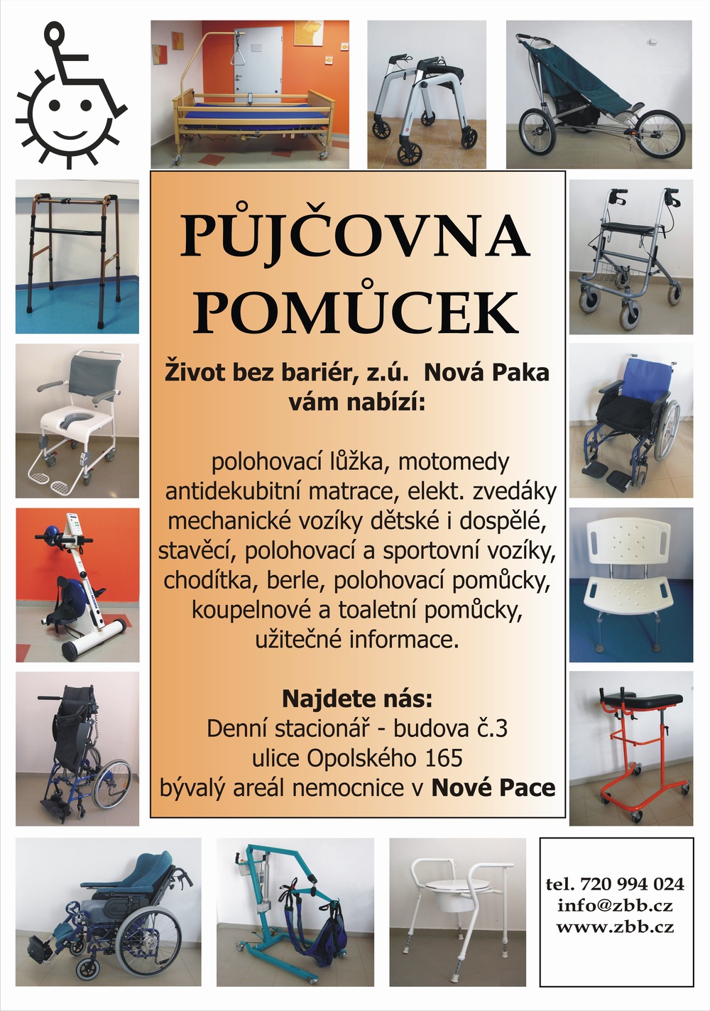 Život bez bariér z. ú., Nová Paka nabízí více jak 150 pomůcek, půjčuje za poplatek do všech koutů ČR. Najdete zde berličky, chodítka, elektrické postele, elektrické zvedáky, koupelnový program, ale také elektrické vozíky či elektrický skútr.