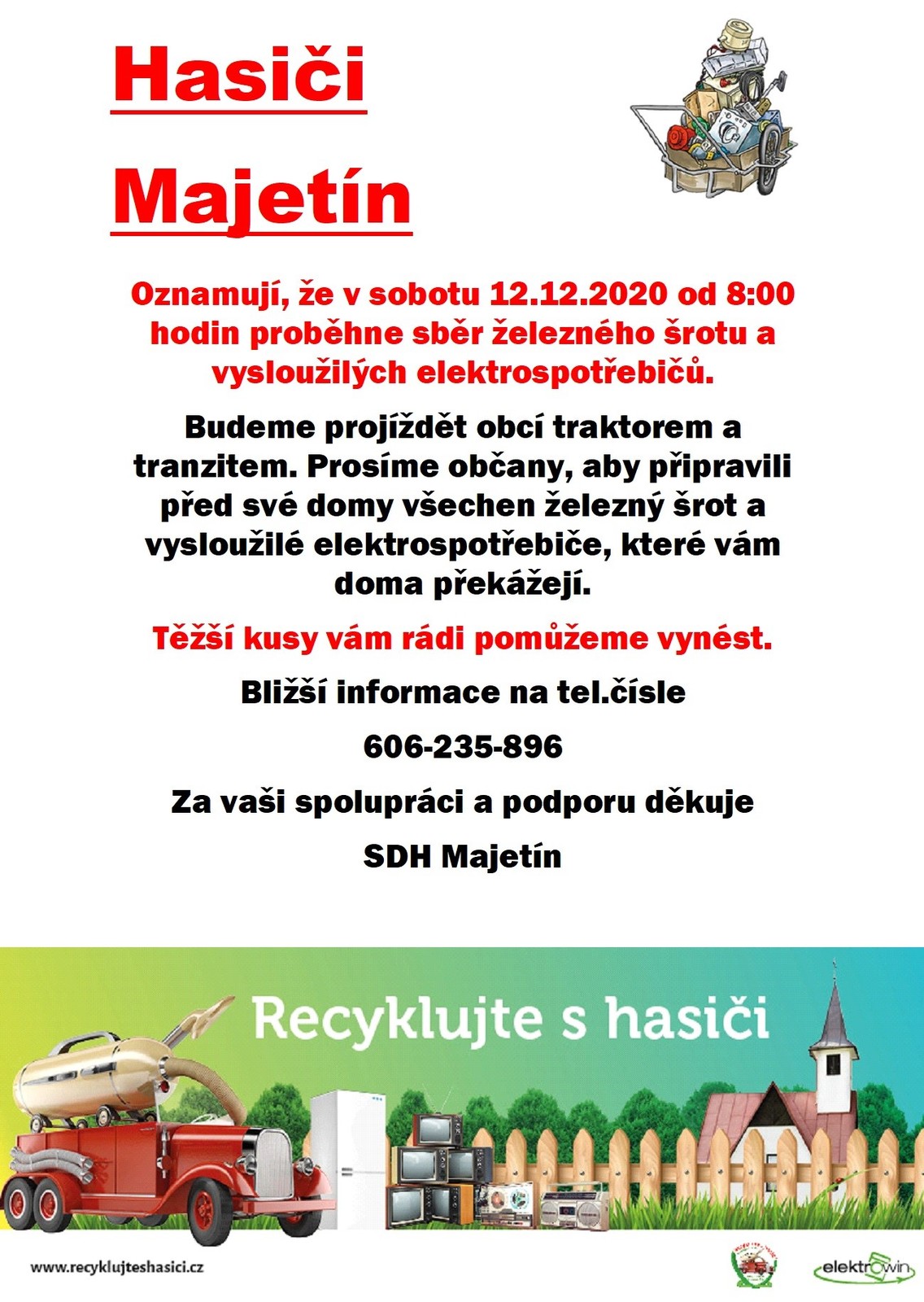Hasiči Majetín oznamují, že v sobotu 12. 12. 2020 od 8 hodin proběhne sběr železného šrotu a vysloužilých elektrospotřebičů. Bližší informace na tel. č. 606 235 896.