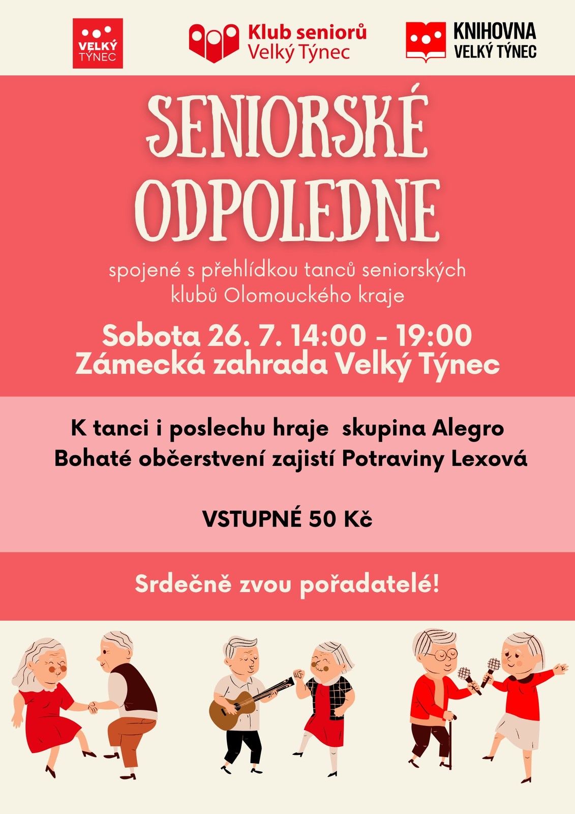 Srdečně zveme na Seniorské odpoledne do zámecké zahrady ve Velkém Týnci. V sobotu 26. 7. od 14 do 19 hodin vás čeká přehlídka tanců seniorských klubů Olomouckého kraje, živá hudba skupiny Alegro a bohaté občerstvení. Vstupné 50 Kč.