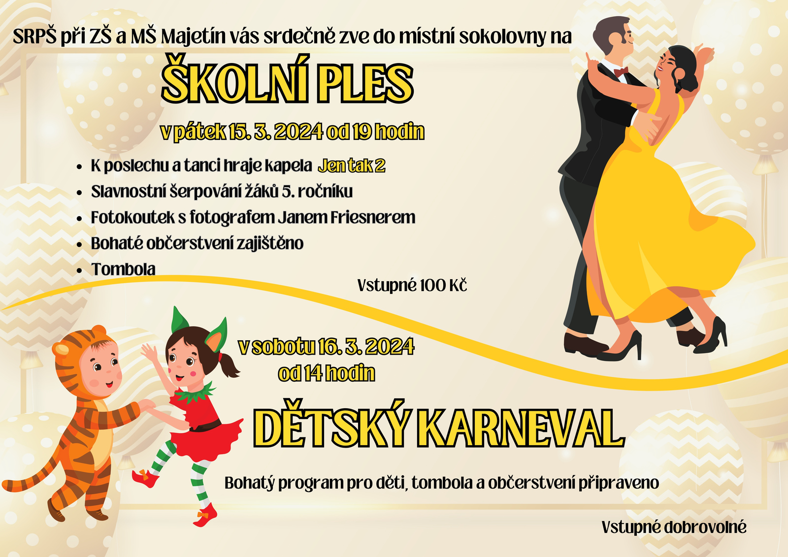 SRPŠ při ZŠ a MŠ Majetín srdečně všechny zve do místní sokolovny v pátek 15. 3. 2024 na ŠKOLNÍ PLES a v sobou 16. 3. 2024 na DĚTSKÝ KARNEVAL.