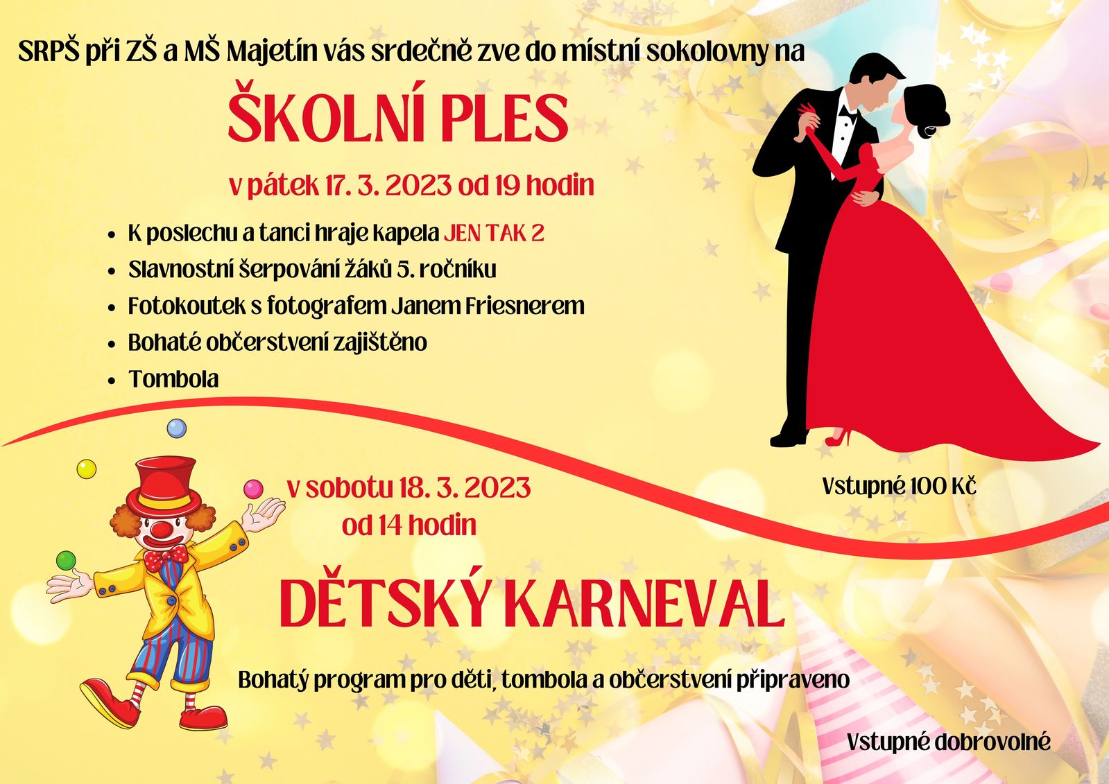 SRPŠ při ZŠ a MŠ Majetín vás srdečně zve do místní sokolovny na ŠKOLNÍ PLES v pátek 17. března 2023 od 19:00 hodin. K tanci hraje kapela Jen Tak 2, slavnostní šerpování žáků 5. ročníku, bohaté občerstvení zajištěno. Vstupné 100 Kč.