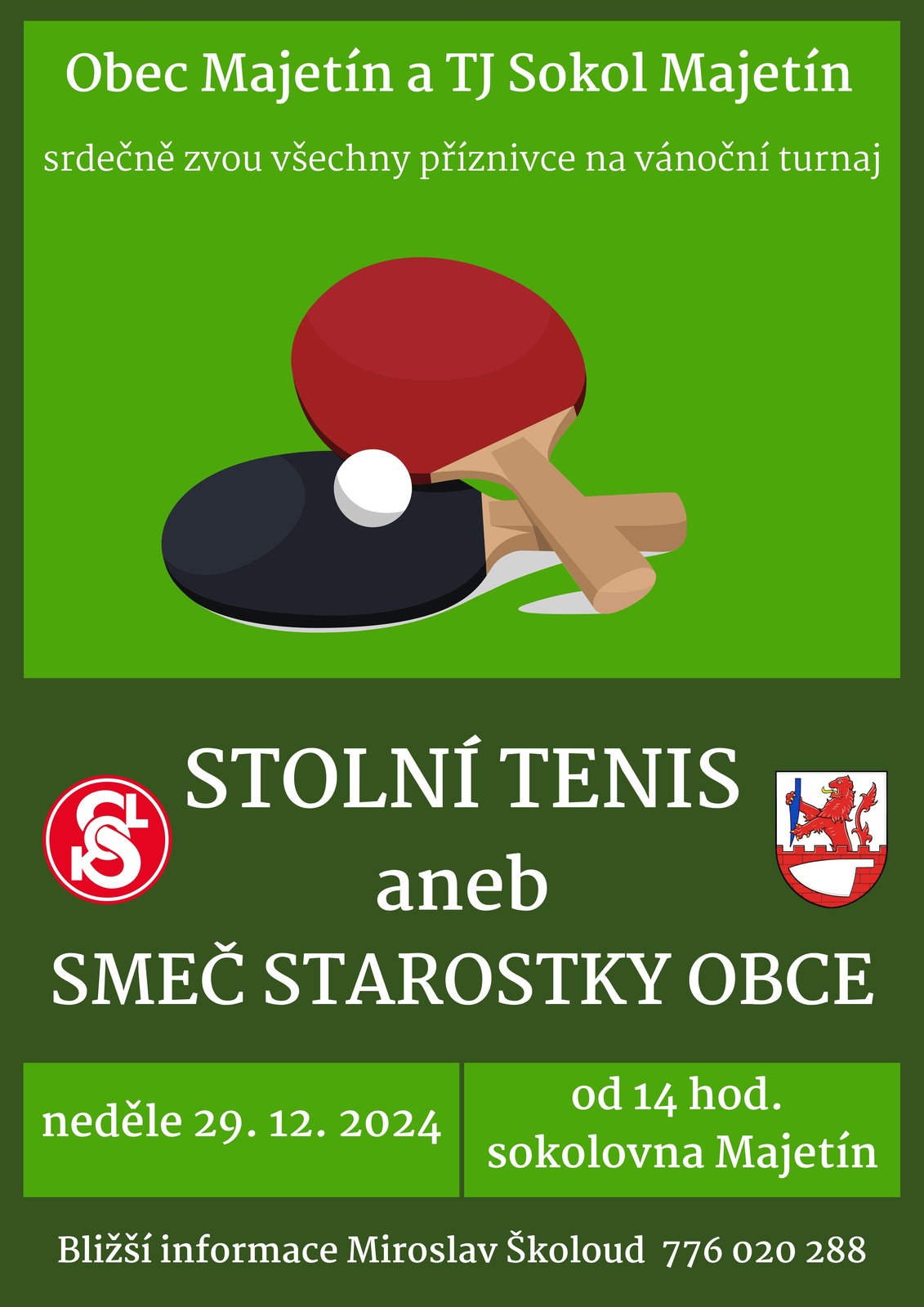 Obec Majetín a TJ Sokol Majetín srdečně zvou všechny příznivce na vánoční turnaj ve stolním tenise aneb SMEČ STAROSTKY OBCE v neděli 29. prosince 2024 od 14:00 hod. v sokolovně Majetín. Bližší informace na tel. 776 020 288