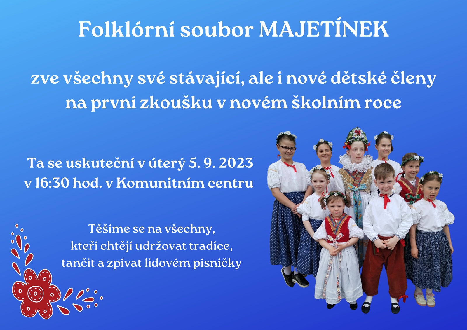 Folklórní soubor MAJETÍNEK zve všechny své stávající, ale i nové dětské členy na první zkoušku v novém školním roce v úterý 5. září 2023 v 16:30 hodin v Komunitním centru Majetín.