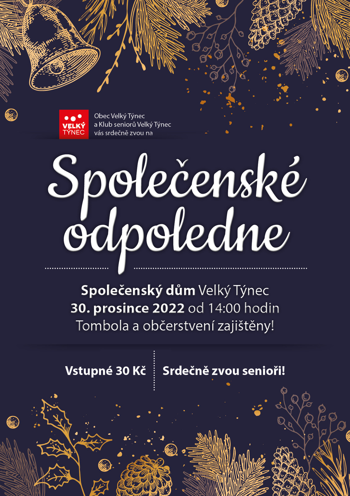 Obec Velký Týnec a Klub seniorů Velký Týnec Vás zvou na "Společenské odpoledne" v pátek 30. prosince 2022 od 14:00 hodin ve společenském domě Velký Týnec. Tombola a občerstvení zajištěny. Vstupné 30 Kč.
