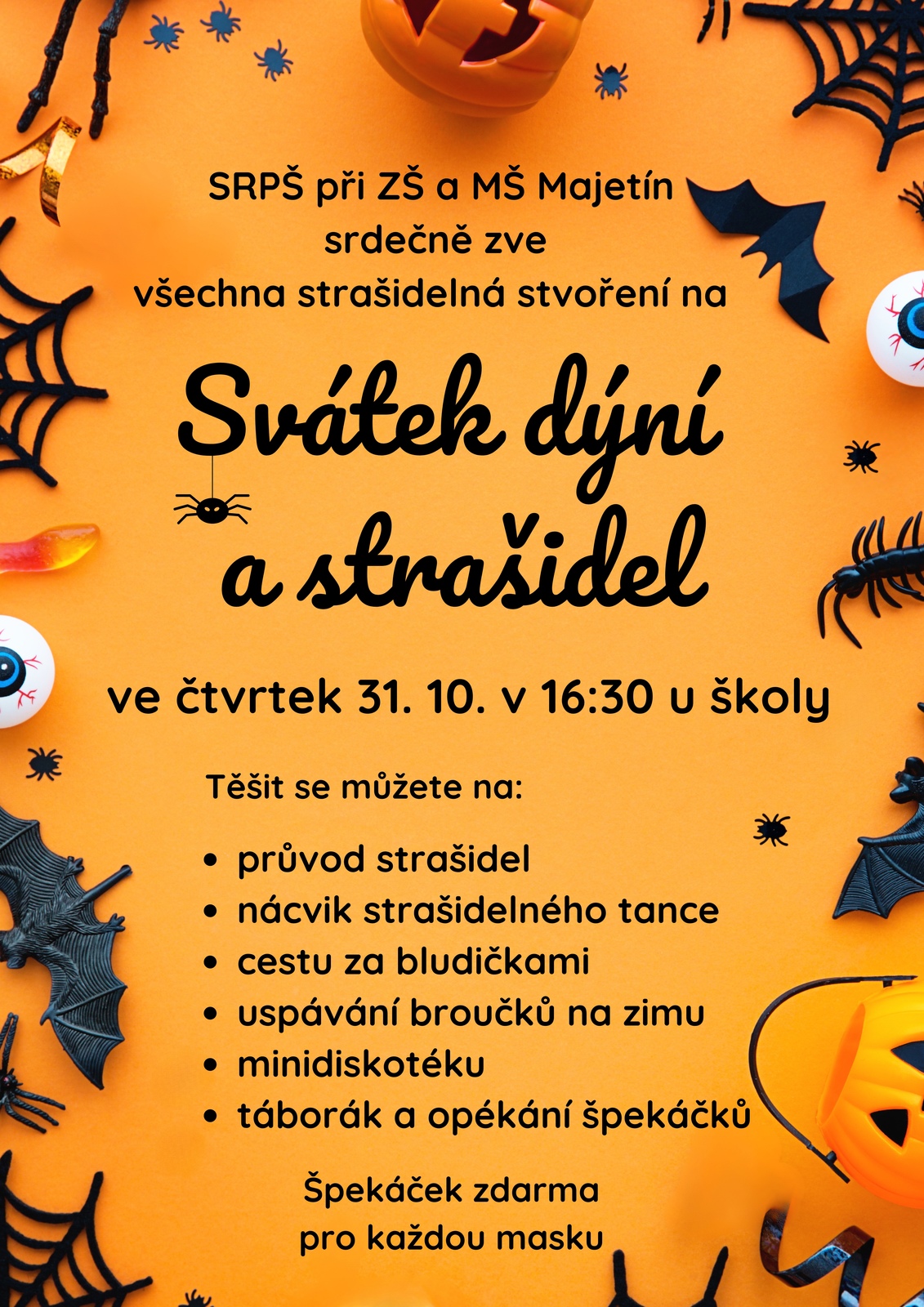 SRPŠ při ZŠ a MŠ Majetín srdečně zve všechna strašidelná stvoření na SVÁTEK DÝNÍ A STRAŠIDEL ve čtvrtek 31. 10. 2024 v 16:30 hodin u školy. Těšit se můžete na průvod strašidel, nácvik strašidelného tance, cestu za bludičkami, uspávání broučků na zimu, minidiskotéku, táborák a opékání špekáčků. Špekáček zdarma pro každou masku.