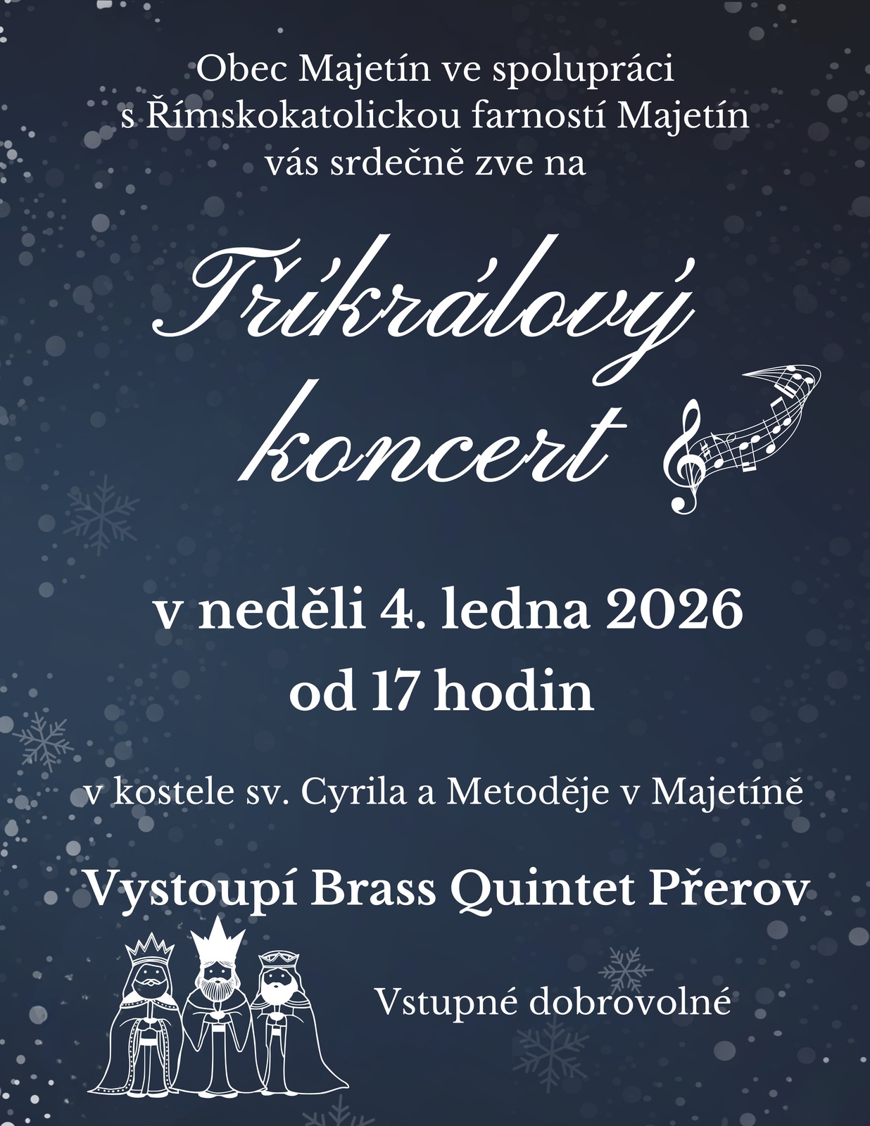 Obec Majetín ve spolupráci s Římskokatolickou farností Majetín vás srdečně zve na "Tříkrálový koncert" v kostele sv. Cyrila a Metoděje v Majetíně.