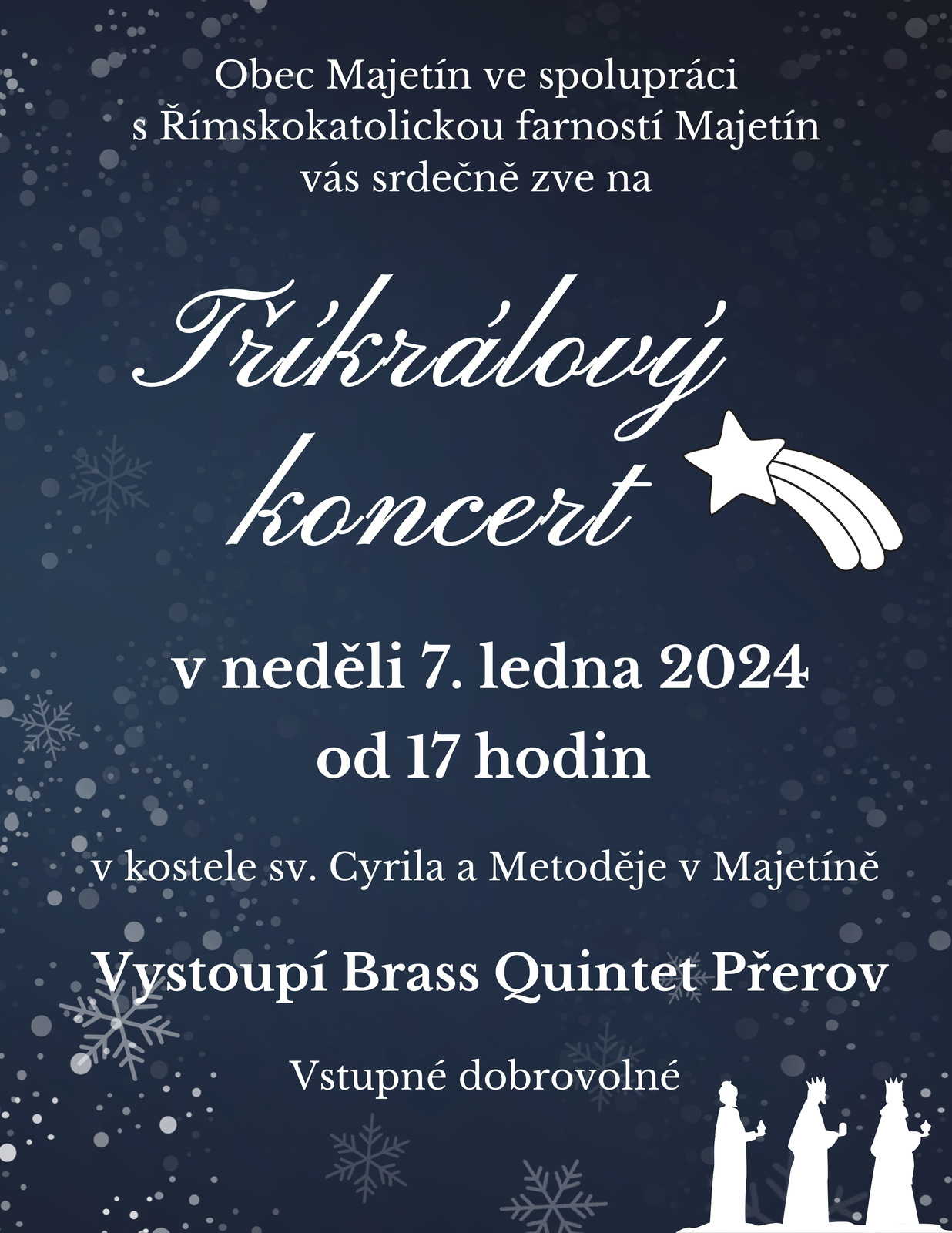 Obec Majetín ve spolupráci s Římskokatolickou farností Majetín Vás srdečně zvou na TŘÍKRÁLOVÝ KONCERT v neděli 7. ledna 2024 od 17:00 hodin v kostele sv. Cyrila a Metoděje v Majetíně. Vystoupí Brass Quintet Přerov.
