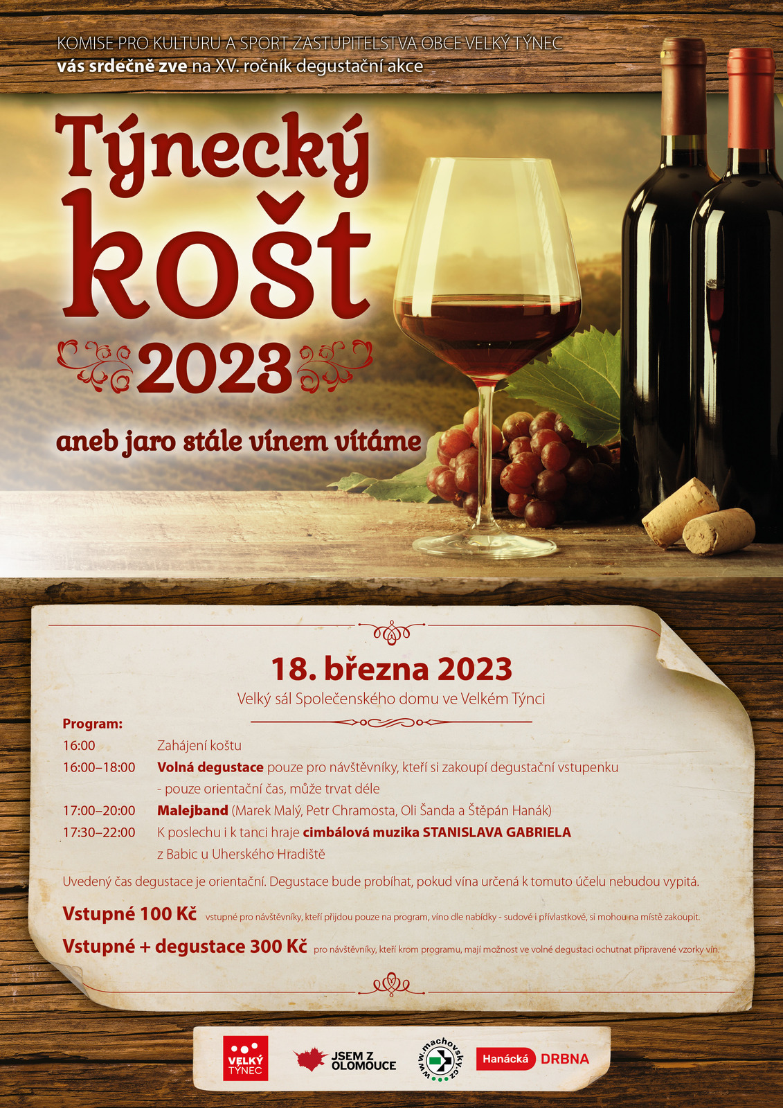 Komise pro kulturu a sport Zastupitelstva obce Velký Týnec Vás srdečně zve na XV. ročník degustační akce "Týnecký košt 2023 aneb jaro stále vínem vítáme" v sobotu 18. března 2023, velký sál společenského domu ve Velkém Týnci, zahájení koštu v 16:00 hodin. Od 17:00 hodin k tanci a poslechu zahraje Malejband a cimbálová muzika Stanislava Gabriela z Babic u Uherského Hradiště. Vstupné 100 Kč, s degustací 300 Kč. Srdečně zvou pořadatelé.