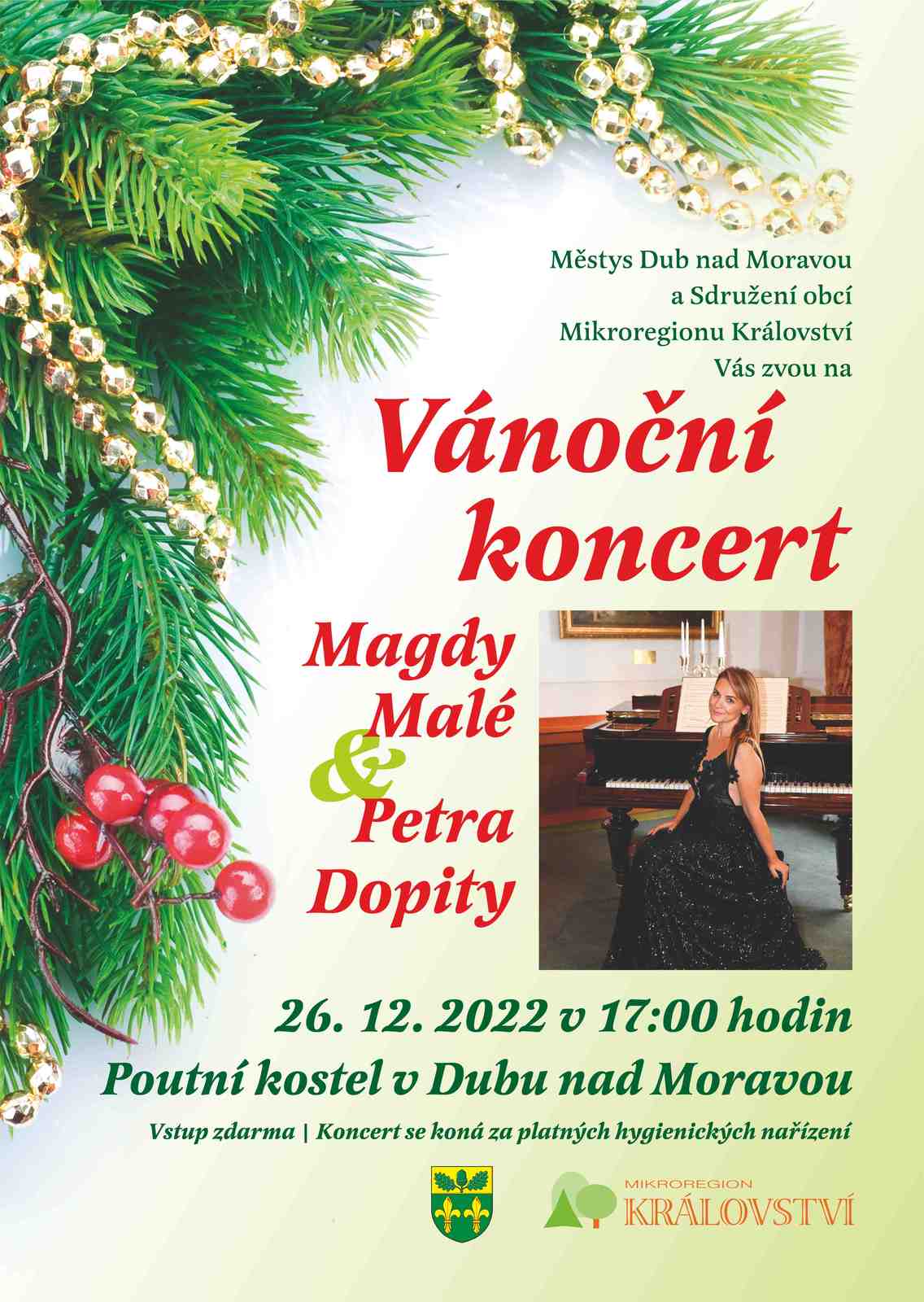 Městys Dub nad Moravou a Sdružení obcí mikroregionu Království Vás zvou na Vánoční koncert Magdy Malé a Petra Dopity v pondělí 26. prosince 2022 v 17:00 hodin v poutním kostele Dub nad Moravou. Vstup zdarma.