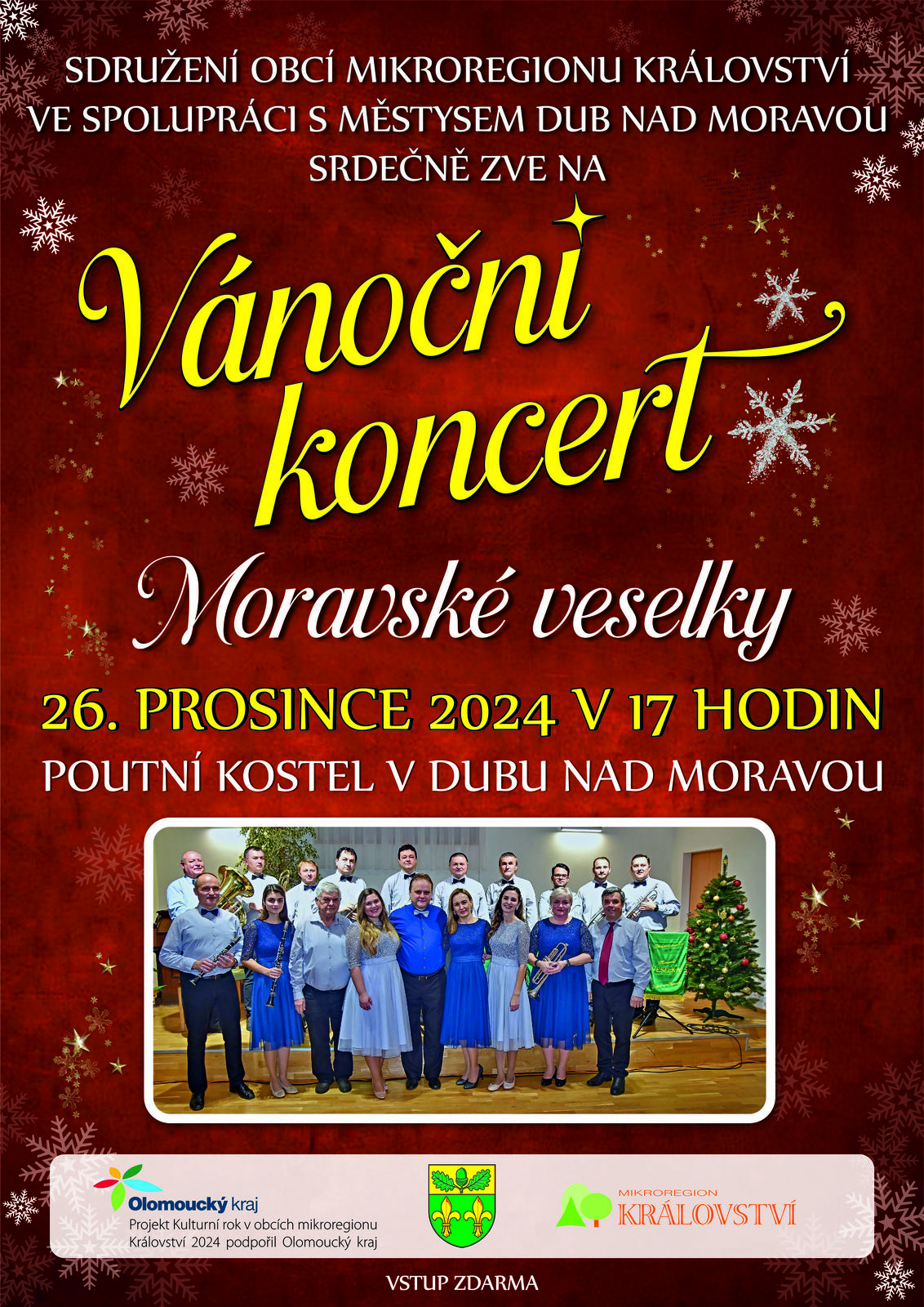 Sdružení obcí mikroregionu Království ve spolupráci s městysem Dub nad Moravou vás srdečně zve na VÁNOČNÍ KONCERT MORAVSKÉ VESELKY 26. 12. 2024 v 17:00 v poutním kostele v Dubu nad Moravou.