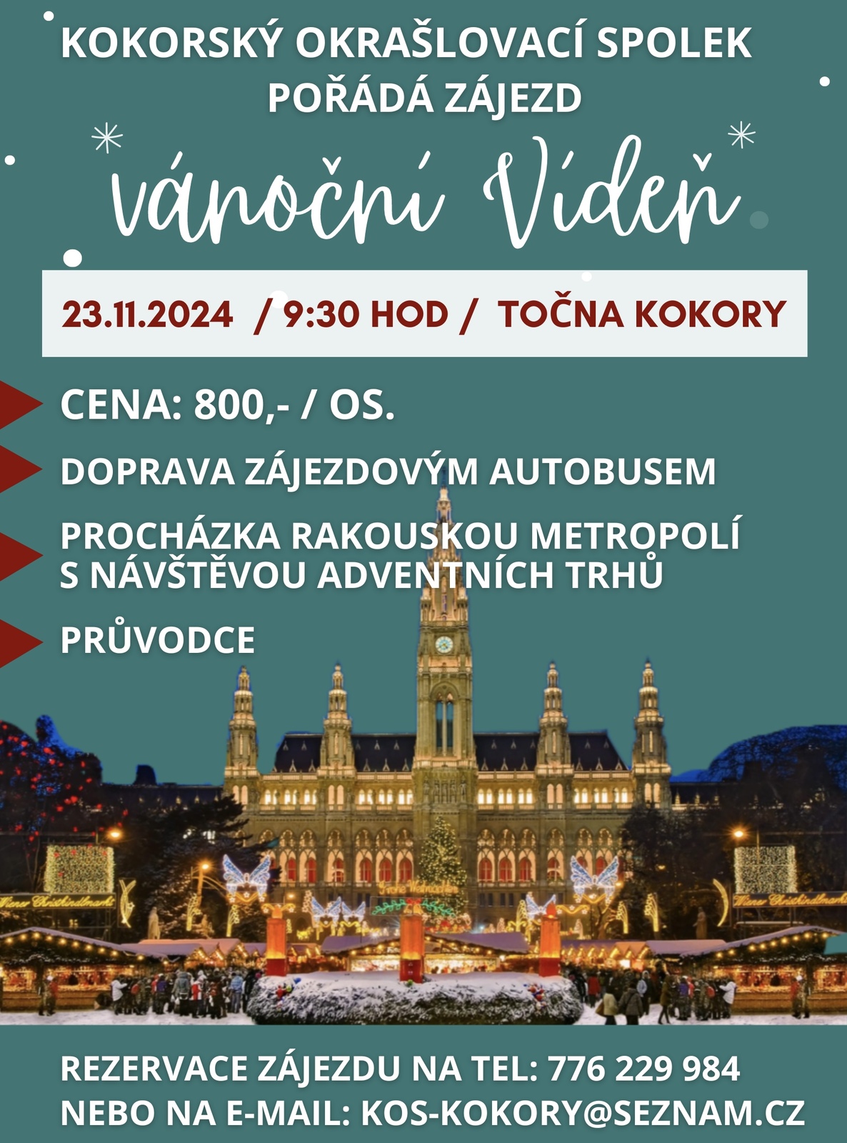 Kokorský okrašlovací spolek pořádá zájezd VÁNOČNÍ VÍDEŇ v sobotu 23. listopadu 2024, doprava zájezdovým autobusem - odjezd v 9:30 hodin, točna Kokory. Cena 800 Kč/os.