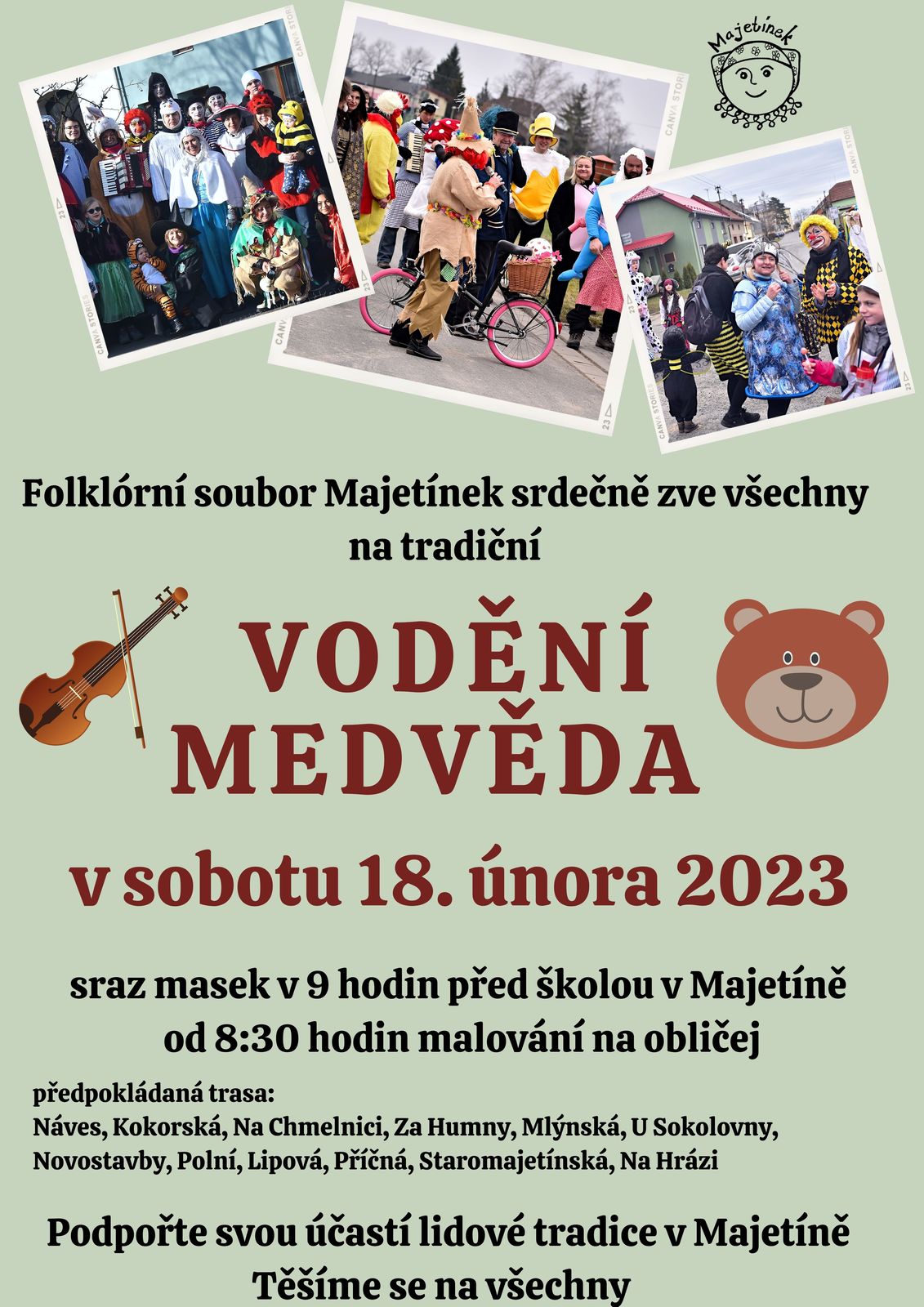 Folklórní soubor Majetínek srdečně zve všechny na tradiční "VODĚNÍ MEDVĚDA" v sobotu 18. února 2023. Sraz masek v 9:00 hodin před školou v Majetíně, od 8:30 hodin malování na obličej.