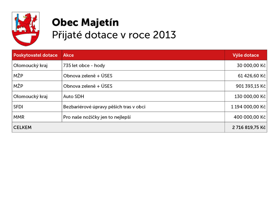 Úvod > Obec, samospráva > Obdržené dotace > Dotace 2013